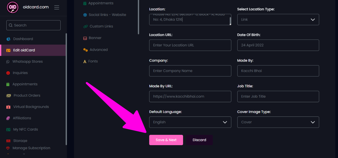 - Made by: সাধারনত আপনার oidCard website-এর সবার নিচে made by লেখা দেখবেন । আপনার oidCard-কে বানিয়েছে এখানে আপনার company name দিতে পারেন।(যেমন: মনে করেন, আপনি xyz company-এর employee এখন xyz compzny বলল যে, আপনার personal নামে website বানান কিন্তু last-এ আমাদের company name xyz দেখায়েন)